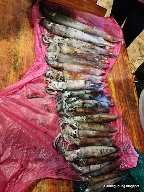 Keesokan paginya, jam 10:00 pagi kami berangkat pulang dengan membawa baki sotong yang kami candat malam tadi. Setibanya kami di Kuala Terengganu, setelah bergambar di Jambatan Angkat dan membeli belah di Pasar Payang, kami mencari kedai makan yang sedia memasak hasil tangkapan kami malam tadi. Beberapa kedai yang kami singgah keberatan memasak sotong yang kami bawa dan akhirnya sebuah kedai berjaya dipujuk untuk mengoreng sotong kami.