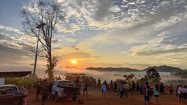 Dari Anjung Selera, kami berkongsi kenderaan pancuan empat roda bersama pengunjung lain menuju ke Air Terjun Pelangi yang berjarak sekitar 18 kilometer melalui jalan tidak berturap membelah kawasan hutan dan menyeberangi sungai. Dalam perjalanan ke air terjun kami singgah di Bukit Sunrise Hill untuk menyaksikan panorama matahari terbit.